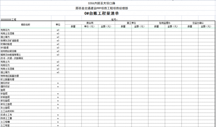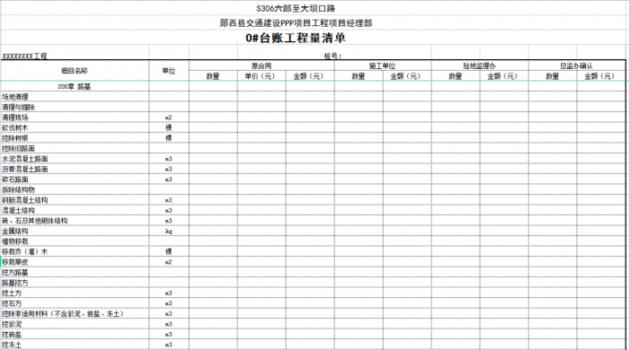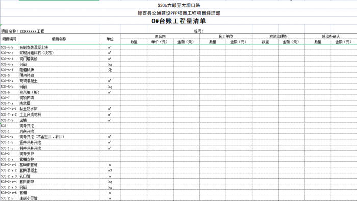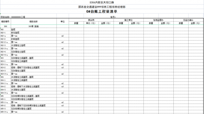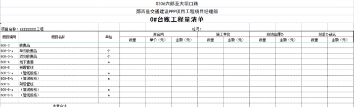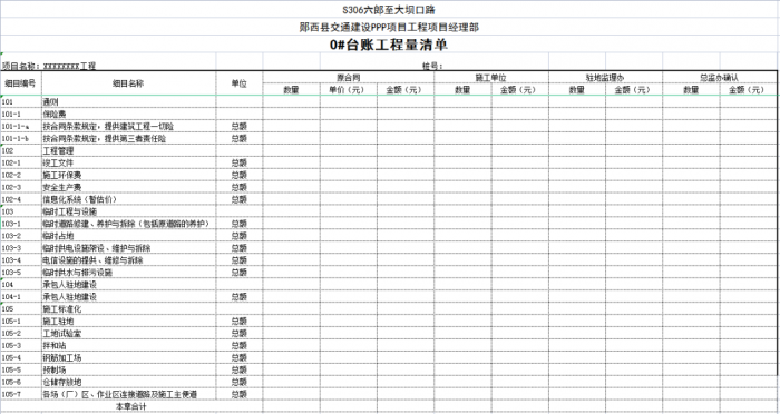 一個(gè)項(xiàng)目或一個(gè)合同段的臺(tái)賬由n條可以獨(dú)立計(jì)量的工程結(jié)構(gòu)(單元)組成,一般情況下一條臺(tái)賬應(yīng)包含子目號(hào)、子目名稱(chēng)、單位、工程數(shù)量、單價(jià)、合價(jià)、里程樁號(hào)、工程部位描述、圖紙編號(hào)、備注說(shuō)明等。